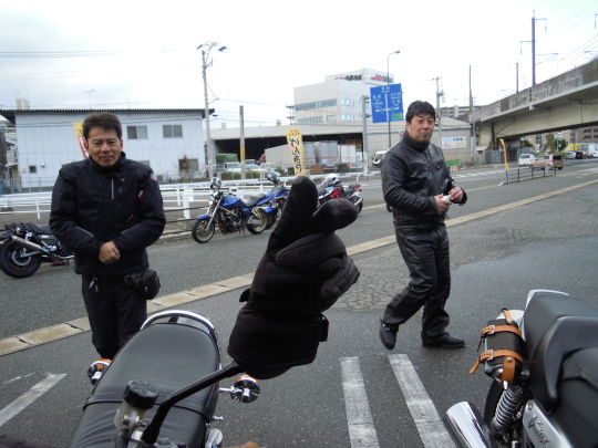 | 途中、集合を断念したHideさんより、TEL入電。 走行中、B+COM通話で中之島公園に 行くことを伝えましたが、停車と同時に Hideさんより入電。 中之島公園に着いたけど、これより上は、 チェーン規制との事。 Hideさんにセブンまで戻って来てもらいました。 これで、16台です。 こんな寒いのに・・・大所帯となってしましました。 みなさん・・・やっぱり・・・好きなんですね・・・MAX。 |