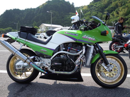 | こちら、本日初参加の、 500-Zimaさんのマシーン、 Kawasaki GPZ900R かなりのカスタム仕様ですね・・・、 足回りは、現役レプリカに負けていませんね・・・。 |