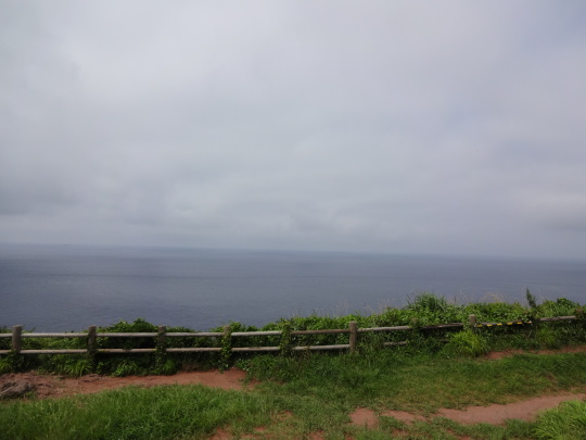 | うす雲ともやで水平線が綺麗に見えませんね。 でも、絶景でした・・・。 先端で撮りたかったんですが、暑さで・・・、 歩くのを断念しました・・・老化も始まってますね〜。 |