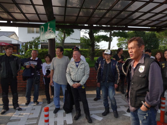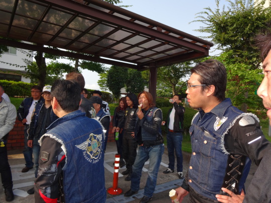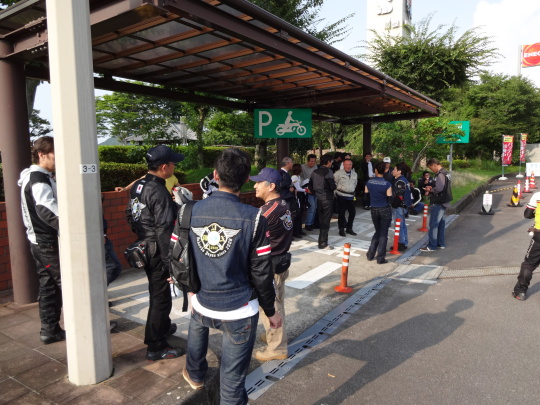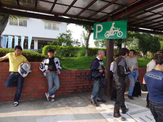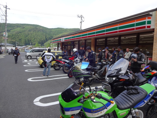 | あちこちで、バイク談義に花が咲いています。 実は、このセブンに入ったときは、 四輪が多かったのですが、私たちが徐々に 駐輪していくと・・・、 すっかり四輪の方が居なくなりました・・・、 これって?、営業妨害かな〜。 |