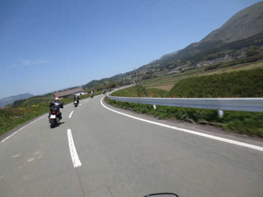 | 各自紹介を終え、 いつもの様に、Yasuリーダーの、 『本日も〜、ご安全に〜』 という発声の元、ツーリングスタートです。 益城熊本空港ICで高速を下り、 南阿蘇グリーンロードをプチ経由して 俵山展望所に向かいます。 |