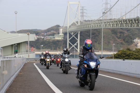 | めかり組の皆さん、ほぼお揃いです。 ここで15台合流し、合計34台になりました。 後、道の駅きくがわ付近で1台合流し、 本日は、35台でのツーリングです。 |