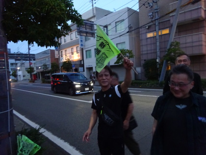歩きます。 さすが安全部長のTomiさん、 横断歩道を渡るときは、 旗を上げてエスコートです。 |