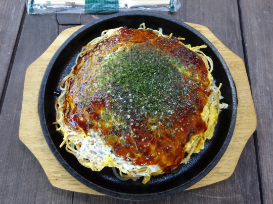 ハーイ、焼けてきました スペシャル、¥1300- (生イカ、生エビ、イカ天、玉子)麺入り 麺がパリパリでシーフードがプリプリ、 ソースも濃厚で美味しいです。 結構ボリュームもあります。 |