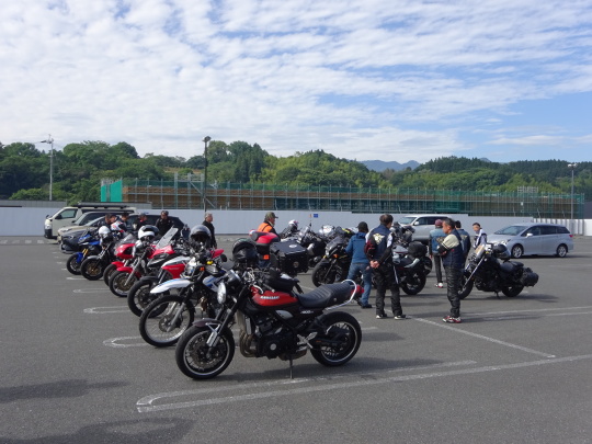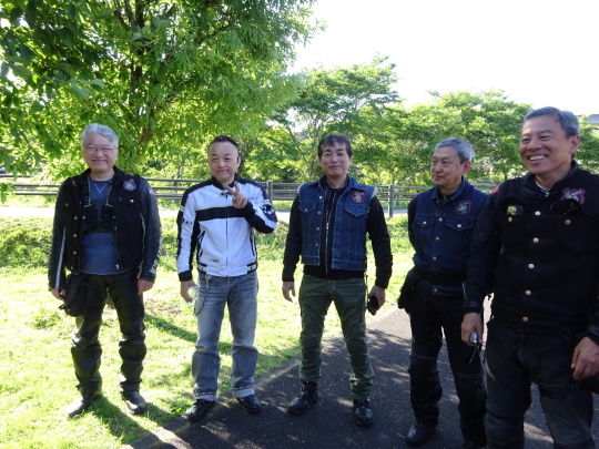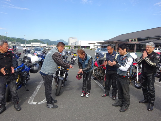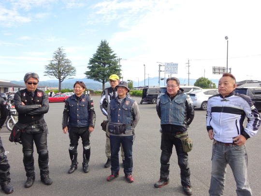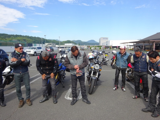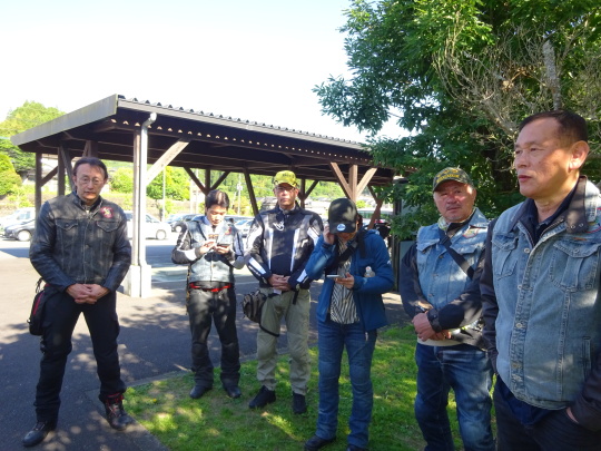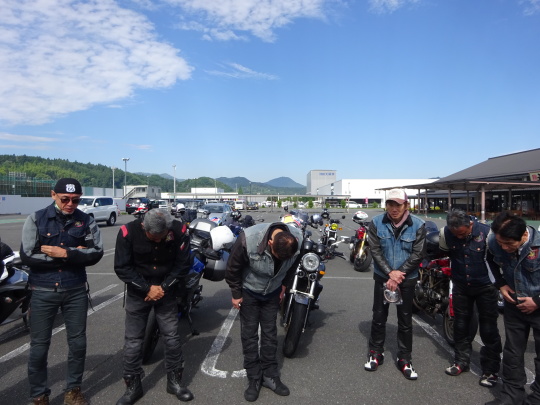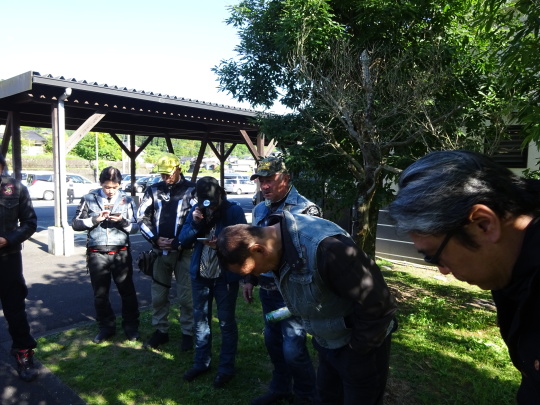 | そして、 先導より簡単にコース説明、 いつもの様に、ルール事の確認を行い、 最後に、「ごあんぜんに〜」 を全員で唱和し、 本日のツー安全遂行を誓い合い、 朝礼終了、出発します。 |