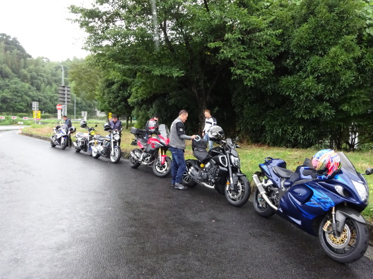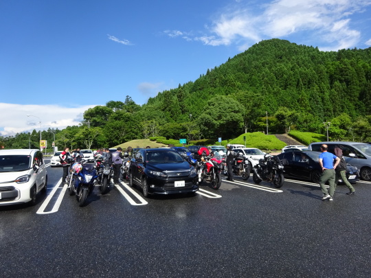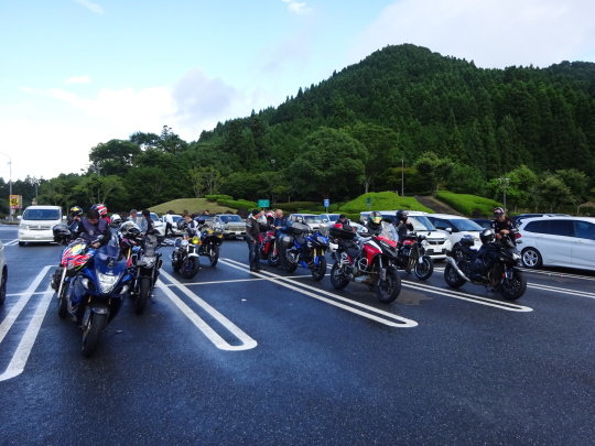 | 玖珠SAに到着。 こちらも、雨上がりの模様です。 ここまで、何とか本降りの降雨走行に 遭遇する事無く来てます・・・奇跡的かな。 |