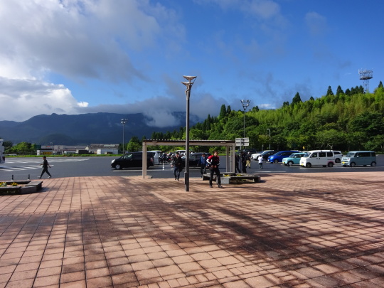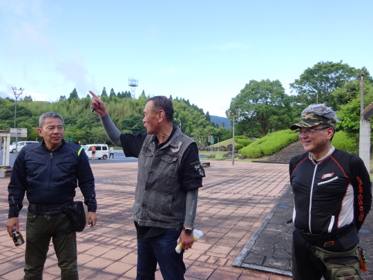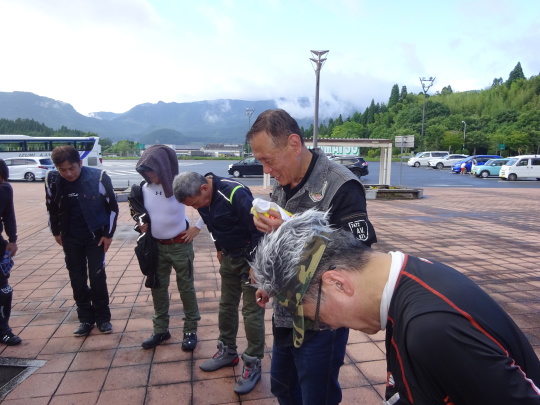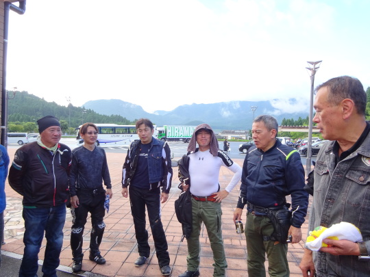 | 道の駅「くにさき」を出発。 国東地区広域営農団地農道 (通称:オレンジロード) を快走の予定でしたが、雨上がりで 落ち葉、落小枝、青苔・・・で渋走、 杵築ICより高速に入り、 由布岳PAで小休止です。 |