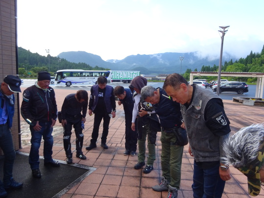 | そして、 先導より簡単にコース説明、 いつもの様に、ルール事の確認を行い、 最後に、「ごあんぜんに〜」 を全員で唱和し、 本日のツー安全遂行を誓い合い、 朝礼終了、出発します。 |