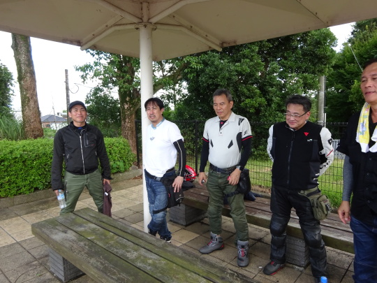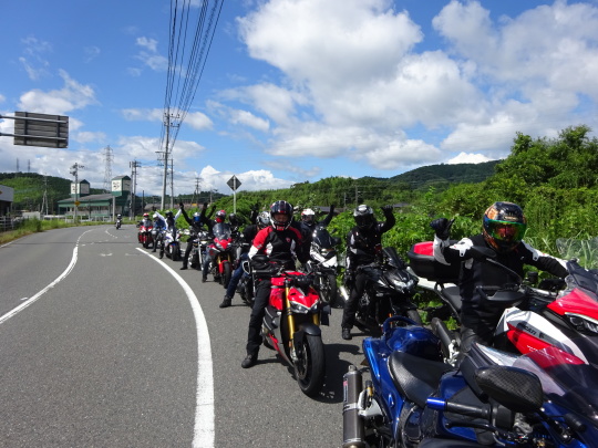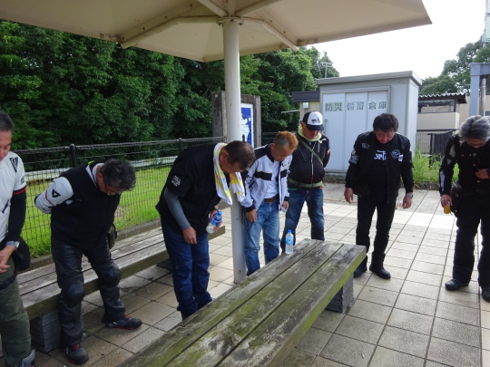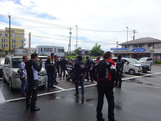 | ここで、6台合流し、全15台の集合完了です。 ここまで走行中は雨上がりのせいか 比較的涼しかったのですが バイクから降りると、 日差しが刺さります・・・。 |