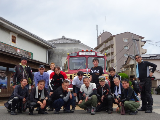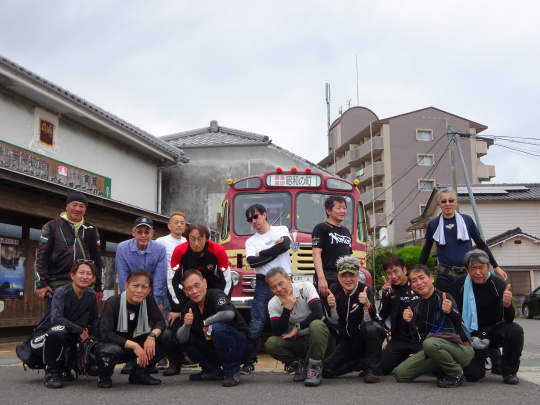 | 駐輪場に戻ってきて、 ボンネットバスを背景に 集合写真を、パチリ。 |