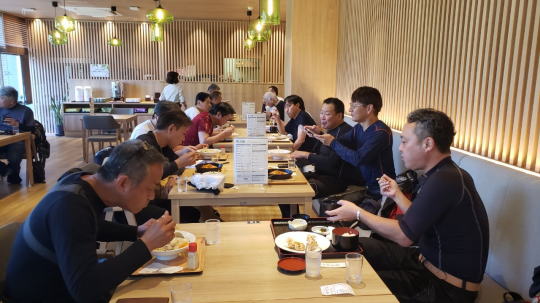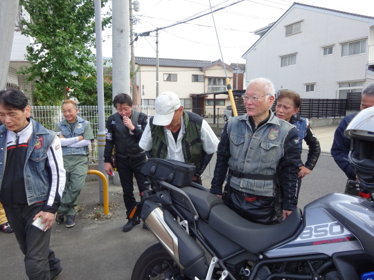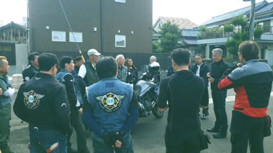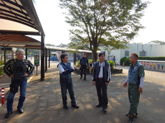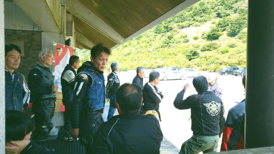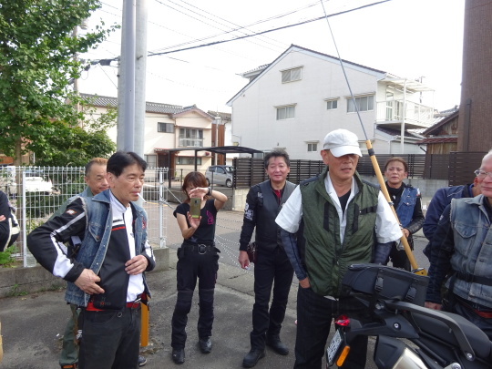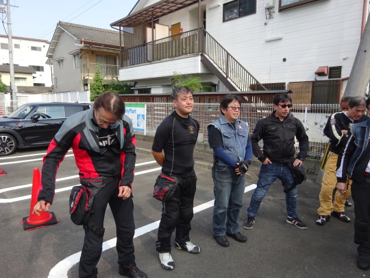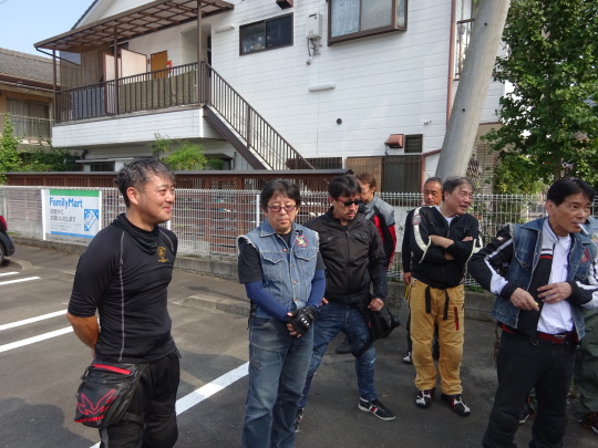 | そして、 簡単にコース説明、 いつもの様に、 ルール事の確認を行い、 最後に、「ごあんぜんに〜」 を全員で唱和し、 本日のツー安全遂行を誓い合い、 朝礼終了、出発します。 |