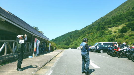| 昼食後、1台離脱し、 12:30、前倒しで 雲仙温泉 青雲荘を出発。 協力金19台分を支払って 雲仙仁田峠循環道路を走行し 仁田峠に到着です。。 |