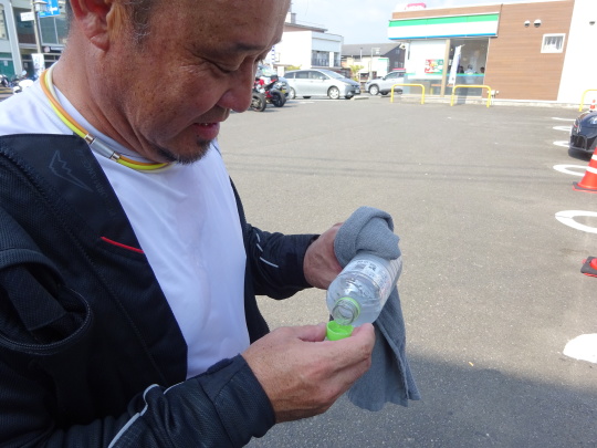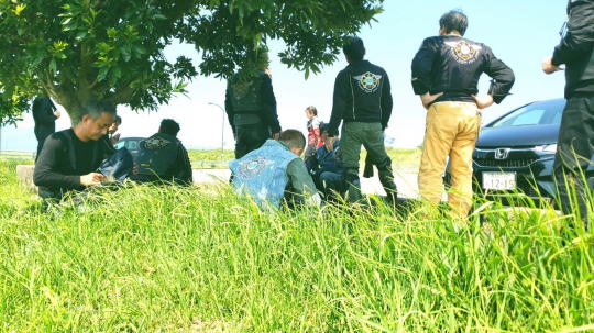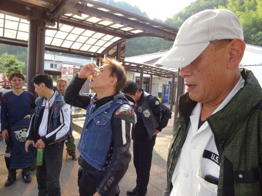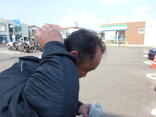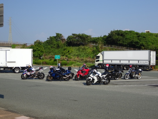 | 高速走行は、 暑くもなく快適でしたが、 バイクを降りると・・・暑い 日陰で、雑談タイムです。 |