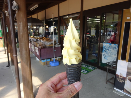 | さて、待ってました、 名物、ミカンソフト¥400- 竹炭のコーンです。 |