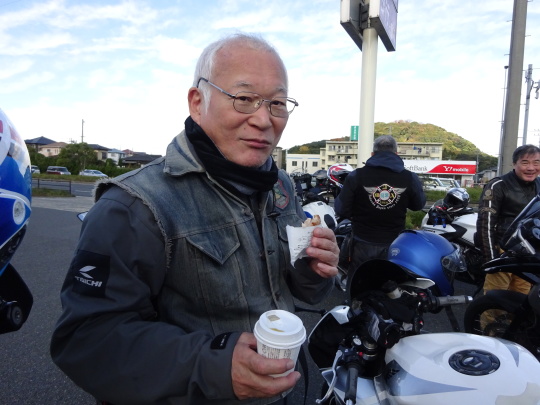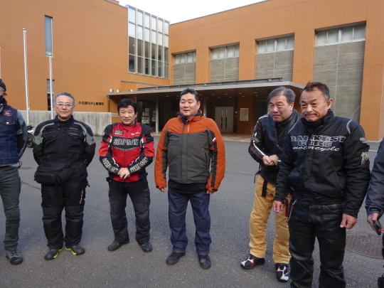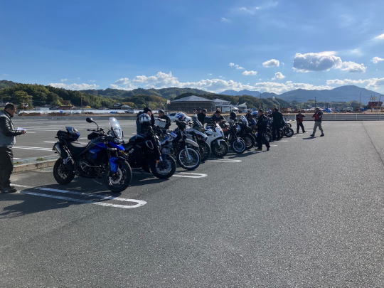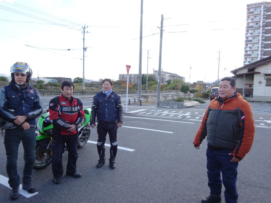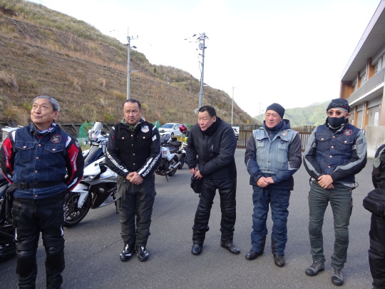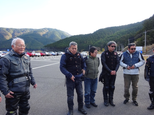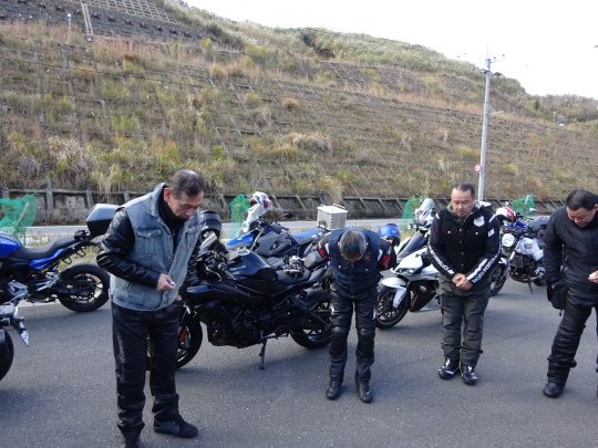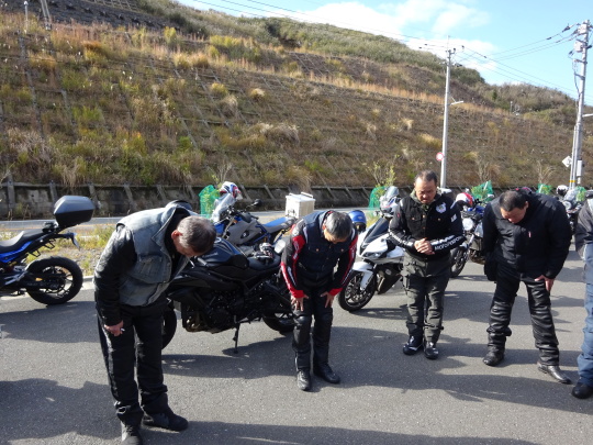 | 最後に、「ごあんぜんに〜」 を全員で唱和し、 本日のツー安全遂行を誓い合い、 朝礼終了、出発します。 |