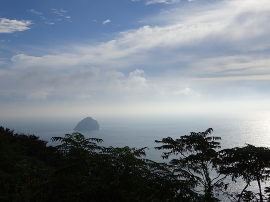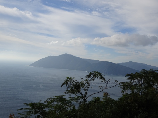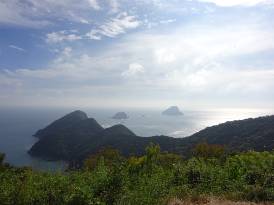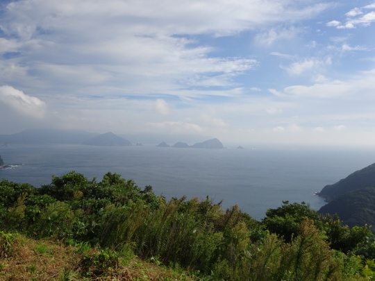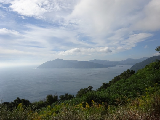 | 写真撮影 靄の所が目的地の鶴御崎 自転車も同様・・・、 サクッと協議の結果、 自転車との並走、対面走行を避け ショートカットする事にしました。 という事で、ここからは、 焦る必要なく、ゆっくりモードです。 |