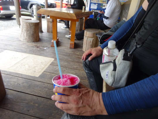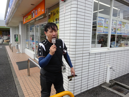 | 空の公園(空の展望所駐車場) を出発(自転車より先行で・・・) 市内目指して海岸沿いを快走 至る所で、誘導員が立ってました。 途中ローソンでお買い物? もうすぐ道の駅なのに、 アイスリンタイム? |